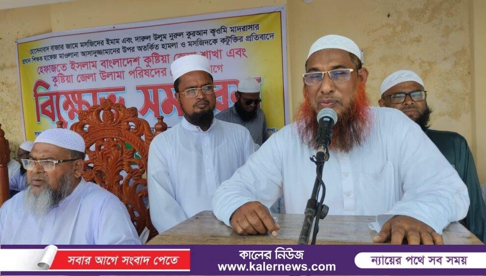 শনিবার সকাল ১০ টাই এক বিক্ষোভ সমাবেশ অনুষ্ঠিত হয়েছে । উক্ত সমাবেশে সভাপতিত্ব করেন হেফাজোত ইসলাম বাংলাদেশ ও ওলামা পরিষদের কুষ্টিয়া জেলা শাখার সভাপতি মুফতি আব্দুল হামিদ। অন্যানদের মধ্যে উপস্থিত ছিলেন হেফাজত ইসলাম বাংলাদেশ ও ওলামা পরিষদের কুষ্টিয়া জেলা শাখার সাধারণ সম্পাদক ও আল্লাহর দর্গা ইদ্রীস আলী বিশ্বাস দাখিল মাদ্রাসার মোহাদ্দেস রফিকুল ইসলাম নদভী, সহসভাপতি আশরাফ আলী, যুগ্ম সম্পাদক হাফেজ মাওলানা গোলাম কিবরিয়া, সাংগঠনিক সম্পাদক হাফেজ মাওলানা দেলোয়ার হোসেন, হাফেজ মাওলানা সাইদুল ইসলাম, হাফেজ মাওলানা আঃ মোমিন, হাফেজ মাওলানা ফরিদ উদ্দিন, হাফেজ মাওলানা হাবিল উদ্দিন, হাফেজ মাওলানা আরিফুজ্জামান,হাফেজ মাওলানা আব্দুল খালেক,মাওলানা ফারুক হোসাইন, মাওলানা আমিনুল ইসলাম প্রমুখ।উল্লেখ্য ১৬/৮/২০২৫ ইং তারিখে দুপুর ২ টাই জমি সংক্রান্ত বিরোধ কে কেন্দ্র করে এলাকার প্রভাবশালী আব্দুল খালেক ও আব্দুল মালেক সহ ৭/৮ জন তার উপর হামলা চালিয়ে মারাত্মক জখম করে। এ ঘটনায দুষিদের গ্রেপ্তারের দাবিতে হেফাজত ইসলাম বাংলাদেশ এ বিক্ষোভ সমাবেশের আয়োজন করেছেন।
