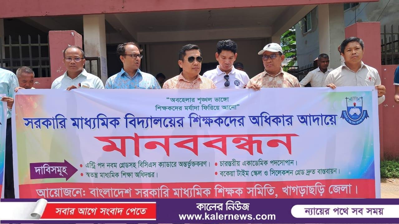খাগড়াছড়ি প্রতিনিধি।। খাগড়াছড়িতে সরকারি মাধ্যমিক বিদ্যালয়ের শিক্ষকদের অধিকার আদায় ও বিভিন্ন দাবি বাস্তবায়নে মানববন্ধন অনুষ্ঠিত হয়েছে। সোমবার (২৫ আগস্ট) সকাল