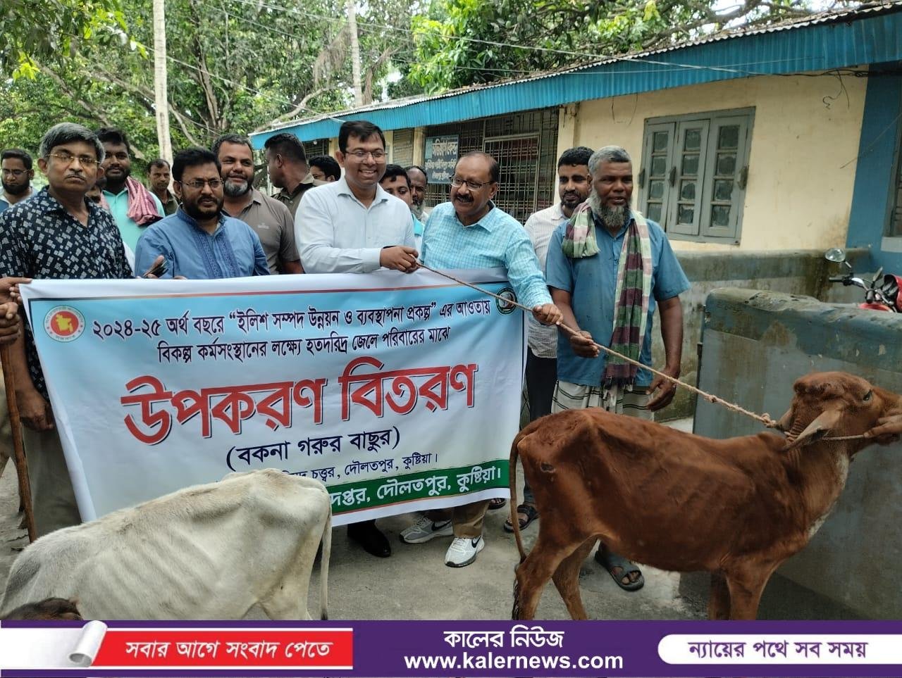 দৌলতপুরে দুস্ত জেলেদের মাঝে বকনা বাচুর গরু বিতরণ দৌলতপুর কুষ্টিয়া প্রতিনিধি: কুষ্টিয়ার দৌলতপুর উপজেলা মৎস্য অফিসের উদ্যোগে রবিবার(২৫মে) সকালে উপজেলার মরিচা, ফিলিপনগর, রামকৃষ্ণ পুর, চিলমারী ৪ ইউনিয়নের দুস্ত
